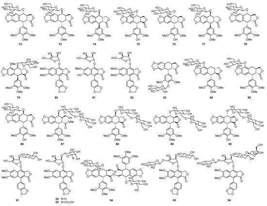 The sugar units usually attached at C-4 consisted of one to several monosaccarides, glucose or apiose (Figure 3). Compounds 72–85 were monoglycosides. Among these compounds, 72–77 and 79 were podophyllotoxin-type glucosides, 80–81 were apioside of diphyllin-type anologues, and 78 and 82 were featured with acetyl substitution attached at the sugar unit. In these structures, the sugar units located at C-4. Compounds 83–86 were also monoglycosides, but the sugar unit attached at C-4′ or C-5 position. Compounds 87–93 were diglucosides with the sugar side chain linked at C-4. Bispicropodophyllin glucoside (94) was an unique dimeric lignan from Withania coagulans, in which the C ring of both units were opened to form two esters linking the two units [55]. Ciliatoside A (95) and B (96) were lignan glycosides possessing potent anti-inflammatory effect from Justicia ciliate, with a three and four sugar side chain, respectively [56].
