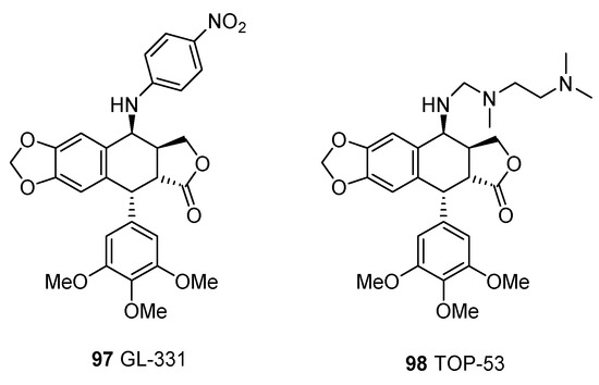 Bioisosterism was a rational strategy in molecular modifications [133]. Recently, substitution of carbon atoms with heteronuclears was carried out to synthesize podophyllotoxin analogues. Pharmacological studies revealed that some nitrogen-containing derivatives, such as GL-331 (97) and TOP-53 (98), exhibited more potent cytotoxic activities than their parent compounds (Figure 4). Additionally, their abilities to reverse multidrug resistance and inhibit P-glycoprotein induced drug efflux were improved.