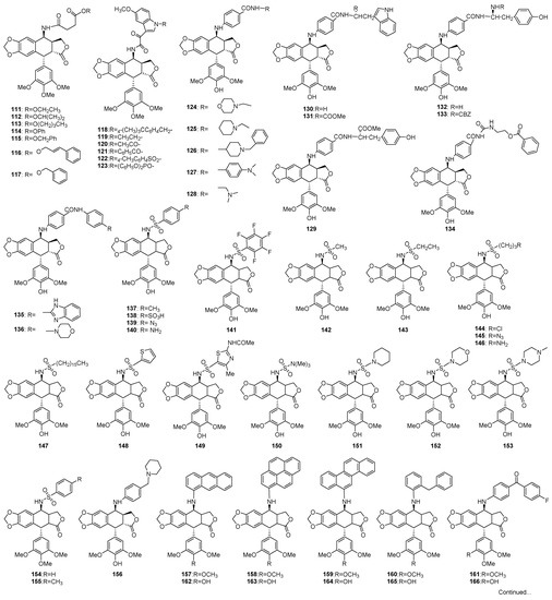 Interestingly, many modifications were focused on transforming the C-4 of podophyllotoxins into an amino group (Figure 6), and pharmacological evaluations showed that some derivatives exhibited superior activity, particularly against the drug-resistant cell lines [139,140]. Introducing amino group into these molecules also made further modifications possible. A series of saturated aliphatic amide derivatives (111–117) were synthesized by linking 4β-amino-4-deoxypodophyllotoxin with succinic acid [141], among which, compounds 113–117 showed more potent antitumor activity than etoposide. More inspiringly, they could reverse MDR against K562/AO2 in vitro. Moreover, some N-substituted-5-methoxy derivatives (118–123) were synthesized and were tested to show comparative activity against HeLa cancer cells with etoposide [142]. In addition, some 4-β-anilino amides exhibited more potent selectivity against several cancer cell lines. For examples, compound 124 (IC50 1.11 μM against A549; 3.23 μM against MCF-7), 127 (IC50 0.71 μM against A549; 0.92 μM against MCF-7) [140], 128 (ED50 2.4 μM against A549, ED50 4.5 μM against MCF-7) and 129 (ED50 0.7 μM against KB; 3.5 μM against KB-7d) [139]. Compounds 137–155 were a series of sulfonamides [138,143], and some of these compounds were 2–10 times more potent than etoposide. Interestingly, compounds 154 and 155 showed selectivity against MDR-MCF7 cell line; while morpholino- and the piperazino-containing sulfonamides derivatives 152 and 153 exhibited selectivity against P388 leukemia and A549 lung carcinoma cell lines. Besides, 4-β-anilino-podophyllotoxins (156) [144], as well as derivatives with expanding conjugated system, i.e., 4β-N-polyaromatic podophyllotoxins (157–166), were synthesized [145]. All of them exhibited significant in vitro anticancer activity and the mechanism were investigated to involve the inhibition of DNA topo-II. Compounds 160–161 and 165–166 were more potent than compounds 162–164 (with C-4′ hydroxyl group in E-ring), indicating that the aromatic group at C-4 and a methoxy at C-4′ might play a vital role in their cytotoxic activity. Several 4β-amino hetereoaromatic ring derivatives (167–174) [146] also exhibited promising anticancer activity against colon cancer cell lines, and compound 174 even showed selectivity against CNS malignant cells.
