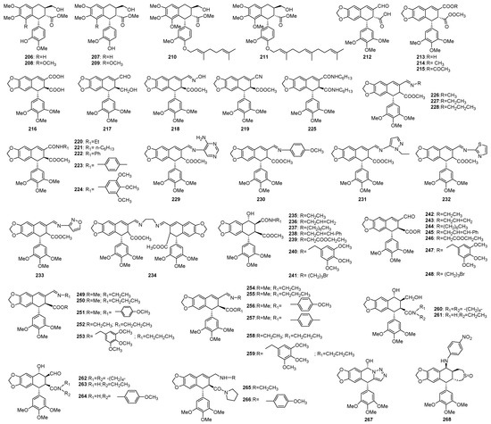 Although ring D was generally supposed to be an essential part for the activities of podophyllotoxins, a series of ring D opened deoxypodophyllotoxin (206–211) showed selective cytotoxicities against the HL-60 cell line (Figure 7) [156]. Oxidization followed by further modification at C-9 led to the synthesis of some carboxylic acid derivatives as esters, amides, nitriles and anhydrides (212–225). Their cytotoxicities were at micromolar range, although less potent than the parent compounds [157]. Besides, reaction of podophyllic aldehyde with aliphatic, aromatic, and heteroaromatic amines led to the synthesis of a series of imines (227–236), and biological evaluations indicated that they could induce microtubule depolymerization, and cells arrested at the G2/M phase [158]. As a continuation of the above research work, the same group further synthetized several series of nonlactonic podophyllic aldehyde analogues (237–268), featured with combinations of aldehyde, imine, amine, ester, and amide functionalities at C-9 and C-9′ of the cyclolignan skeleton. Among these compounds, 249–253 with an aldehyde or imine at C-9 and an ester at C-9′ were the most potent with IC50 values in the nanomolar range, and some of them showed several times more potent cytotoxicity against HT-29 and A-549 carcinoma than MB-231 melanoma cells. The mechanisms of these structures were found to be involved with two different mechanisms, i.e., cell death induction by cell cycle arrest and the microtubule-disrupting capacity [159].