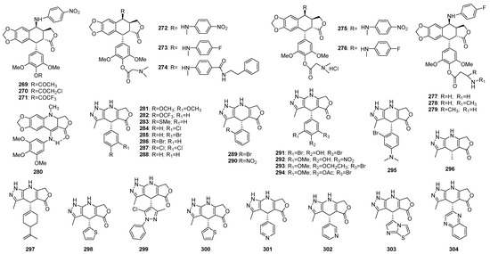 Besides those ring D opened derivatives, compound 267 with a 1,5-disubstituted triazole ring instead of the lactone motif was synthetized, which showed moderate cytotoxicity with similar mechanism to podophyllotoxin [160]. Another derivative (268) with a substituted cyclosulfite ring exhibited significantly cytotoxicity [161].