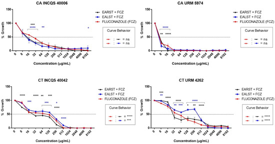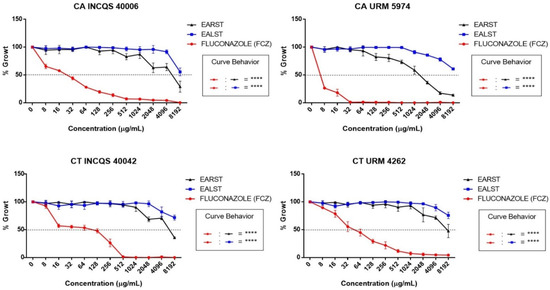Cell viability curve of fluconazole and aqueous extracts of Spondias tuberosa against Candida strains. CA: Candida albicans; CT: Candida tropicalis; INCQS: National Institute of Quality Control in Health; URM: University Recife Mycology; EALST: Extract Aqueous of Spondias tuberosa Leaves; EARST: Extract Aqueous of Spondias tuberosa Root; FCZ: Fluconazole; ****—statistical significance with p < 0.0001.