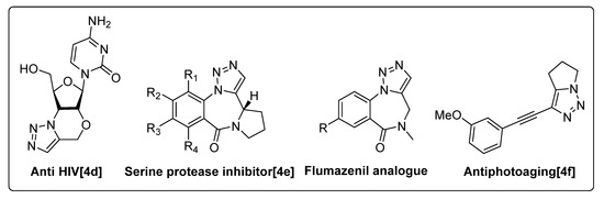 - Mohapatra, D.K.; Maity, P.K.; Shabab, M.; Khan, M.I. Click chemistry based rapid one-pot synthesis and evaluation for protease inhibition of new tetracyclic triazole fused benzodiazepine derivatives. Bioorg. Med. Chem. Lett. 2009, 19, 5241–5245. [Google Scholar] [CrossRef] [PubMed]
