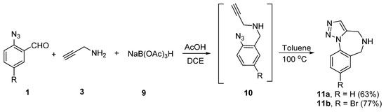 - Arigela, R.K.; Sharma, S.K.; Kumar, B.; Kundu, B. Microwave-assisted three-component domino reaction: Synthesis of indolodiazepinotriazoles. Beilstein J. Org. Chem. 2013, 9, 401–405. [Google Scholar] [CrossRef] [PubMed]