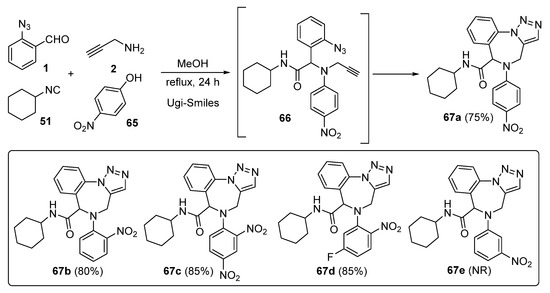 - Mina Saeedi, Mohammad Mahdavi, Alireza Foroumadi, Abbas Shafiee, Synthesis of novel fused 4,5-dihydro-1,2,3-triazolo[1,5-a][1,4]benzodiazepine derivatives via four-component Ugi-Smiles-type reaction. Tetrahedron 2013, 69, 3506–3510. [CrossRef]