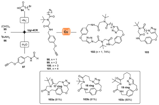 - Zakharova, E.A.; Shmatova, O.I.; Kutovaya, I.V.; Khrustalev, V.N.; Nenajdenko, V.G. Synthesis of macrocyclic peptidomimetics via the Ugi-click-strategy. Org. Biomol. Chem. 2019, 17, 3433–3445. [Google Scholar] [CrossRef] [PubMed]