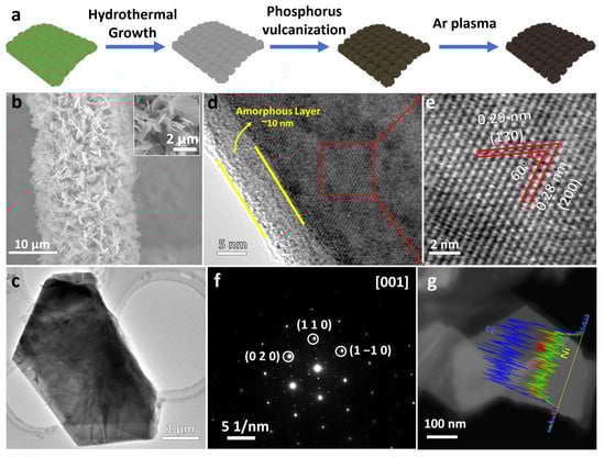Self-supported monoclinic NiPS3 nanosheets were prepared on carbon cloth (CC) by a two-step process. Then, Ar plasma etching was conducted to modify the surface (Ar-NiPS3) (Figure 1a, details provided in the Experimental Section). To investigate the effect of synthesis conditions, different sintering temperatures were applied. As shown in Figures S1 and S2, phase-pure NiPS3 NSs were obtained between 450 °C and 550 °C. When the temperature was further increased to 650 °C, Ni17S18 became the main phase of the NSs and a higher temperature resulted in the collapse of the NSs (Figure S2d). To further determine the best sintering conditions, X-ray diffraction patterns and Raman spectra were obtained for different samples prepared under the temperature between 450 °C and 550 °C (Figures S3 and S4). No obvious differences were detected for any of the samples. NiPS3 powder was also prepared via a solid-state reaction for a comparison (Figure S5). Linear sweep voltammetry (LSV) curves for different samples prepared between 450 °C and 550 °C showed that the sample prepared at 470 °C showed the best HER performance (Figure S6). Thus, 470 °C was chosen as the optimal temperature to prepare NiPS3 NSs. To study the morphology and microstructure evolution of Ar-etched NiPS3 NSs, scanning electron microscopy (SEM) and transmission electron microscopy (TEM) were applied. The SEM and TEM images showed that Ar etching did not change the overall morphology of the NSs (Figure 1b,c), indicating their stability. High-resolution transmission electron microscopy (HRTEM) images showed representative interplanar spacings of 0.29 nm and 0.29 nm with an angle of 60°, which were, respectively, assigned to the (130) and (200) planes of monoclinic NiPS3 (Figure 1d,e). The corresponding selected area electron diffraction (SAED) pattern taken along the [0 0 1] zone axis is presented in Figure 1f, which was indexed to monoclinic NiPS3. This further revealed the single-crystal characteristics of the fabricated NiPS3 nanosheet arrays. A high-angle annular dark field–scanning transmission electron microscopy–energy-dispersive X-ray spectra (HAADF-STEM-EDS) line scan was used to investigate the elemental distribution and ratio of the nanosheet. The results revealed the homogeneous distribution of both Ni, P, and S elements across the whole nanoflower, and the ratio was about Ni:P:S = 1:1:3 (Figure 1g).