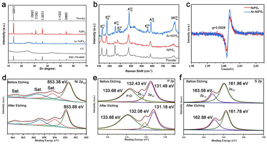 (a) XRD patterns of NiPS3 powder, NiPS3 NSs, Ar-NiPS3 NSs, and CC; (b) Raman spectra of NiPS3 powder, NiPS3 NSs, and Ar-NiPS3 NSs; (c) EPR spectra of NiPS3 NSs and Ar-NiPS3 NSs; XPS spectra of (d) Ni 2p, (e) P 2p, and (f) S 2p regions of NiPS3 NSs before and after Ar etching.
