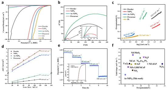 (a) iR-corrected LSV curves of different samples measured in 1 M KOH and (b) Nyquist plots of different samples; (c) corresponding Tafel slopes; (d) electrochemical double-layer capacitance of the corresponding samples of the as-prepared Ar-NiPS3, NiPS3 NS, NiPS3 powder, and Ni precursor; (e) stability test of Ar-NiPS3 NSs (LSV curves before and after 1000 CV are shown in the inset); (f) comparison of HER activities of Ar-NiPS3 and other representative electrocatalysts reported in refs. [19,43,44,45,46,47,48,49,50,51].