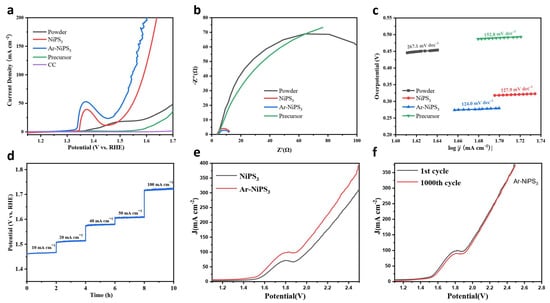 Electrochemical OER performance of different samples: (a) iR-corrected LSV curves of different samples measured in 1 M KOH; (b) Nyquist plots of different samples; (c) corresponding Tafel slopes; (d) stability test of Ar-NiPS3 NSs under different current densities; (e) performance of the full water-splitting device using the Ar-NiPS3 and NiPS3 electrode as both the anode and cathode; (f) stability test before and after 1000 CV cycles of Ar-NiPS3.