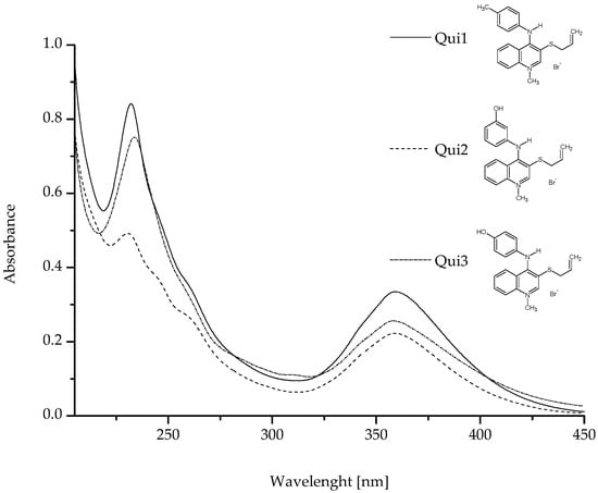 In order to determine the properties of tested compounds (Qui1, Qui2 and Qui3), their spectroscopic analysis was performed. The absorption spectra of Qui1, Qui2 and Qui3 in phosphate buffer (pH = 7.4; 5 × 10−2 M) have been presented in Figure 1. The values of the samples’ mean molar absorptivity and mean absorbance have been collected in Table 1.
