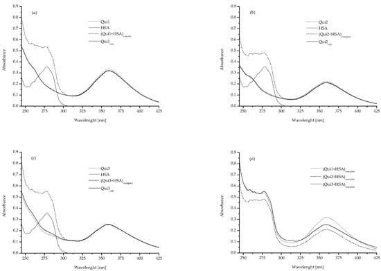 The absorption spectra of Qui1, HSA, (Qui1 + HSA)complex and Qui1calc = (Qui1 + HSA)complex − HSA (a); Qui2, HSA, (Qui2 + HSA)complex and Qui2calc = (Qui2 + HSA)complex − HSA (b); Qui3, HSA, (Qui3 + HSA)complex and Qui3calc = (Qui3 + HSA)complex − HSA (c); (Qui1 + HSA)complex, (Qui2 + HSA)complex and (Qui3 + HSA)complex (d); Qui1, Qui2 and Qui3 concentration 5 × 10−5 M, HSA concentration 2.5 × 10−5 M; ligand: HSA molar ratio (in (Qui-HSA)complex) 2:1.