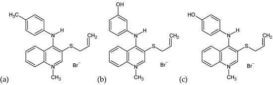 Human serum albumin (HSA) was purchased from MP Biomedicals. 1-methyl-3-allylthio-4-(4′-methylphenylamino)quinolinium bromide (Qui1, Figure 3a), 1-methyl-3-allylthio-4-(3′-hydroxyphenylamino)quinolinium bromide (Qui2, Figure 3b) as well as 1-methyl-3-allylthio-4-(4′-hydroxyphenylamino)quinolinium bromide (Qui3, Figure 3c) were obtained by alkylating the corresponding 1-methyl-4-(phenylamino)quinolinio-3-thiolates (1-methyl-4-(4′-methylphenylamino) quinolinium-3-thiolate, 1-methyl-4-(3′-hydroksyphenylamino)quinolinium-3-thiolate, 1-methyl-4-(4′-hydroksyphenylamino)quinolinium-3-thiolate) with allyl bromide using the previously described method [2,56,57]. Spectroscopic parameters of the obtained compounds are given in Supplementary Materials. 2,2-Diphenyl-1-picrylhydrazyl (DPPH), 6-hydroxy-2,5,7,8-tetramethylchroman-2-carboxylic acid (TPTZ) and 2,2′-Azino-bis(3-ethylbenzothiazoline-6-sulfonic acid) diammonium salt (ABTS) were obtained from Sigma Aldrich. Potassium persulfate (PPS), hydrochloric acid (HCl) as well as ascorbic acid (AA) were purchased from Chempur. All chemicals were of analytical grade and used without further purification.