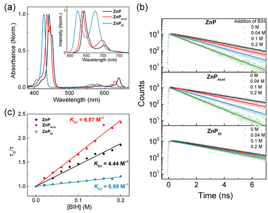 (a) Steady-state absorption and emission (inset) spectra of ZnPs in DMF, (b) representative fluorescence decay profiles of ZnPs with the addition of BIH (λex = 400 nm; λdet = 645, 635, and 620 nm for ZnP, ZnPAcet, ZnPEt, respectively; solid lines are the single exponential fit; see the complete set of decay profiles in Figure S1 of the Supporting Information), and (c) Stern-Volmer plot (solid lines are the linear fit).