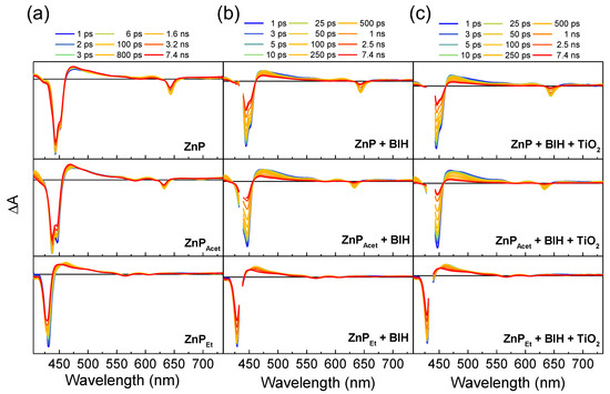 TA spectra at selected time delays of (a) ZnPs, (b) ZnPs + BIH, and (c) ZnPs + BIH + TiO2 in DMF. The amount of each component in the 4 mL solution was 10 μM ZnPs, 0.3 M BIH, and 1 mg TiO2. The data near 435 nm were omitted in (b,c) due to the scattered pump light.