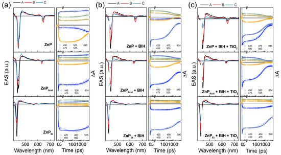 EAS (left) and representative decay profiles (right) of (a) ZnPs, (b) ZnPs + BIH, and (c) ZnPs + BIH + TiO2 in DMF obtained from the global fits to the TA data. The first-order kinetic model (A→B→C→ground state (GS)) was used in the fit. The EAS data near 435 nm were omitted in (b,c) due to the scattered pump light. The solid lines in the decay profiles are the fits.