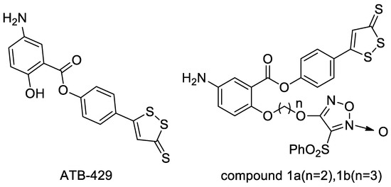 ATB-429 is a hybrid of mesalamine and ADTOH, which has improved anti-inflammatory and analgesic activity (Figure 4). ATB-429 significantly reduced gastrointestinal side effects compared to mesalamine, especially in a mouse model of colitis with better anti-inflammatory activity. ATB-429 exerts anti-inflammatory effects in LPS-induced liver injury, lung injury, ulcerative colitis. Additionally, it has anti-inflammatory effects in NSAID-induced gastric mucosal injury. ATB-429 is superior to mesalamine in reducing mucosal damage and disease severity; moreover, it significantly reduces the infiltration of chronic granulocytes and the expression of several important inflammatory cytokines mRNA. ATB-429 has entered Phase III clinical trials with the U.S. FDA [22]. Inspired by the above findings, Wang et al. [23] designed and synthesized a series of ATB-429 derivatives containing NO-releasing moieties, and evaluated its anti-tumor activity. The results showed that the derivatives have strong anti-tumor activity. Among them, compound 1a (IC50 = 2.677 µM), 1b (IC50 = 3.051 µM) against MCF-7 cancer cell line and 1a (IC50 = 1.270 µM) against DU145 cancer cell line are more active than Vandetanib (IC50 = 3.536, 1.974 µM).