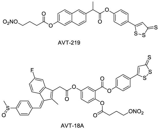 AVT-219 and AVT-18A (Figure 6) are NOSH drug complexes formed by combining naproxen and sulindac with ADTOH and NO donors [27]. Both AVT-219 and AVT-18A maintain the anti-inflammatory and anti-platelet aggregation properties of naproxen and sulindac. However, the side effect of naproxen and sulindac on the gastrointestinal tract is reduced. These NOSH compounds also have the ability to inhibit the growth activity of many tumor cells, including colon cancer cells, breast cancer cells, and pancreatic cancer cells [28].