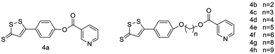 - Sun, Y.; Zhang, Y.; Li, Y.; Cheng, J.; Chen, S.; Xiao, Y.; Ao, G. Synthesis and biological evaluation of novel hydrogen sulfide releasing nicotinic acid derivatives. Bioorg. Med. Chem. 2016, 24, 5368–5373. [Google Scholar] [CrossRef] [PubMed]