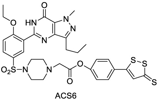 Sildenafil is a drug that treats erectile dysfunction and pulmonary arterial hypertension. Muzaffar et al. used sildenafil as the parent and ADTOH to form the derivative ACS6 (Figure 15) and showed that ACS6 could enhance the efficacy by slowly releasing hydrogen sulfide, and its diastolic effect on spongy smooth muscle was much stronger than that of the parent drug sildenafil [47] and comparable to sildenafil citrate. Both inhibited oxygen radical generation in pulmonary artery endothelial cells compared with NaHS solution, but the effect was stronger than that of NaHS solution. Moreover, NaHS acts through the cAMP/PKA pathway, and ACS6 activates both the cAMP/PKA and cGMP/PKG pathways. It was also found that ACS 6 protects PC12 cells by upregulating paraoxonase-1 (PON-1) levels, which exerts anti-Hcy-induced neurotoxic and anti-oxidative stress effects [48,49].