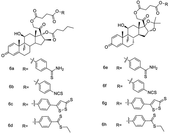 Asthma is a heterogeneous clinical syndrome. Glucocorticoids are the most effective drugs for treating inflammation in asthma patients. Recent studies have shown that H2S has positive effect on this disease. Considering that an improved pharmacological activity and a reduced toxicity can be obtained through hybridization, Giordano et al. [50] designed and synthesized novel betamethasone and triamcinolone hybrids with H2S -donors (Figure 16). These synthesized compounds have potential H2S-releasing characteristics both in a cell-free environment and into the cytosol of BSMCs (bronchial smooth muscle cells). Among them, the most promising derivatives 6b and 6f have significant inhibitory effect on mast cell degranulation, resulting in a reduction of β-hexosaminidase release more efficiently than the corresponding parent drugs.