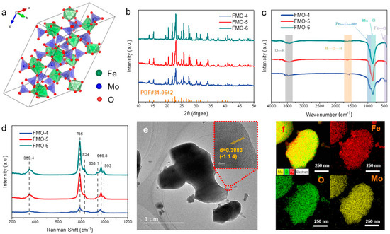 (a) Crystal unit cell illustration (blue represents Mo, yellow represents Fe and magenta represents O); (b) XRD patterns of the FMO samples; (c) FT-IR spectra; (d) Raman profiles; (e) TEM and HR-TEM images of FMO-6; and (f) element maps.