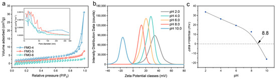 (a) Nitrogen adsorption–desorption isotherms (inset: pore size distribution curve for FMO); (b) Zeta-potential in solutions of various pH with 2, 4, 6, 8, and 10; (c) Zeta potentials of FMO-6 at different pH values.