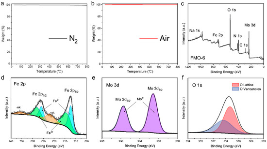(a) TGA analysis of FMO-6 conducted in N2; (b) TGA analysis of FMO-6 conducted in air; (c) full XPS spectrum of FMO-6; high-resolution XPS spectra showing (d) Fe 2p, (e) Mo 3d, and (f) O 1 s binding energies of FMO-6.