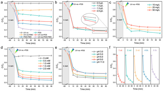 The effects of the FMO-6 system, catalyst dose, pollutant concentration, PDS dose, and pH on the catalytic efficiency were studied by performing five recovery experiments under the same conditions (25 °C, 1 mM PDS, 20 mg/L MO, 0.5 g/L FMO-6, pH = 6, 1000 W Xenon lamp). As shown in Figure 5a, the degradation rates for MO were 0%, 40%, and 55% for the three systems involving UV–vis only, PDS only and UV–vis+PDS, respectively. After the addition of FMO-6, the degradation rates increased to 19%, 66.8%, and 81.5%, respectively. These results showed that FMO-6 had good photocatalytic and PDS activation properties, and there was a synergistic effect between UV–Vis and PDS for the FMO-6 system. Figure 4b shows the effect of catalyst dose on MO degradation efficiency and indicates that there was only a small increase in degradation rate as the dose of FMO-6 was increased. This may be because the FMO-6 catalyst is rich in oxygen vacancies, so a low dose provides enough active sites; therefore, the effect of dose on catalytic activity is not significant. The effect of the initial MO concentration on the degradation efficiency is shown in Figure 4c, which indicates that the degradation efficiency decreased as the pollutant concentration was increased. However, the amount of pollutant removed increased with increasing pollutant concentration, indicating that the catalyst exhibited good catalytic performance. As shown in Figure 4d, there was a significant effect of PDS dose on the degradation rate of MO, which increased with increasing PDS dose. The degradation rate was 70% at 0.5 mM and 93% when the PDS dosage was increased to 2 mM. Figure 5e shows the effect of pH on the rate of degradation for MO. This was consistent with the results in Figure 2c, where there was a significant decrease in the degradation rate of MO when the pH exceeded the pHPZC for FMO-6 (8.8). This may be because at pH 9 and 11, FMO-6 was negatively charged on the surface and repelled , thus reducing the efficiency of the system.