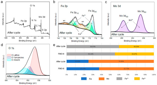 (a) the full XPS spectra of FMO-6 after cycling; High-resolution XPS spectra of (b) Fe 2p (c) Mo 3d and (d) O 1 s of FMO-6; (e) calculated Fe/Mo ratio and Fe3+/Fe2+ ratio.