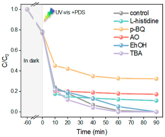 To assess the active species in the UV–vis+PDS+FMO-6 system and reveal the reaction mechanism, trapping experiments were carried out, as shown in Figure 6. Here, L-histidine [30], p-BQ [31], and AO [32] acted as scavengers of , and h+. When these trapping agents were added to the system, the MO degradation efficiencies were reduced to 88.98%, 67.64%, and 82.77%, respectively. This indicated that plays a major role in this system, followed by h+ and . EhOH can be utilized as a scavenger of and •OH, and TBA can be used as a scavenger of •OH [33,34]. Surprisingly, when TBA and EhOH were added to the system separately, it was seen that •OH hardly participated in MO degradation, and that played a small role.