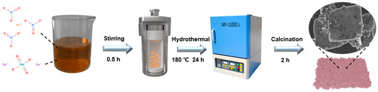 Fe2(MoO4)3 was synthesized by a simple hydrothermal method. Briefly, 2.9034 g of Na2MoO4·2H2O and 3.232 g of Fe(NO3)3·9H2O were weighed according to obtain a ratio of Mo/Fe 3:2. Then, the compounds were dissolved separately in 36 mL of deionized water, mixed well, transferred to a hydrothermal reactor, and heated to 180 °C for 24 h. After cooling to room temperature, the resulting precipitate was washed 3 times with ultrapure water and alcohol and dried at 60 °C for 12 h. Finally, they were calcined in an air atmosphere at 2 °C min−1 and at different temperatures (400, 500, and 600 °C). The catalyst preparation process is shown in Figure 8.