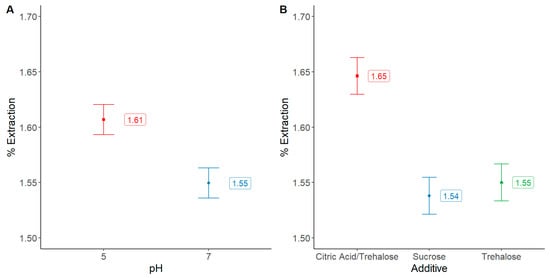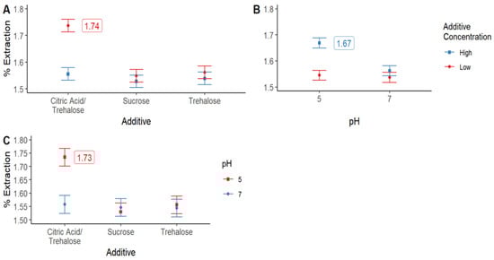 Since all the interactions among the three factors were statistically significant (p < 0.05), each interaction was plotted (Figure 2); from them, it can be concluded that higher extraction yields can be obtained after using buffered solutions at pH 5 added with a mixture 0.1% of citric acid + trehalose. The addition of sucrose or trehalose alone did not show significant differences between the tested levels, and their extraction yields were the lowest.