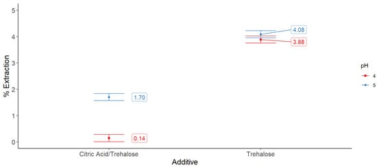 A second set of experiments was carried out using a solution-volume/biomass ratio of 200:1 v/w. Considering the previous result, where the lower pH gave better extraction yields, we next tested buffered solutions at pH 4 and 5 to respect the tendency of better extractions using lower pH values. Again, the mixture of citric acid + trehalose and trehalose alone were used as additives in the same concentrations as before (0.1 and 0.5%). We could not detect a significative difference (p < 0.05) of the additives’ concentration; however, when trehalose was used alone, higher extraction yields were obtained, 3.98 ± 0.06%. In general, the extraction rates were three times those observed in the previous experiment, as shown in Figure 3.