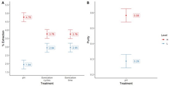 Comparative extraction yields (A) of phycocyanin (%) as function of several factors (pH, L = 5 H = 7; sonication cycles, L = 2 H = 4; sonication time, L = 30 s H = 60 s), and (B) purity of the pigment as function of pH level. Bars show the means and least significant difference intervals for 95% confidence.