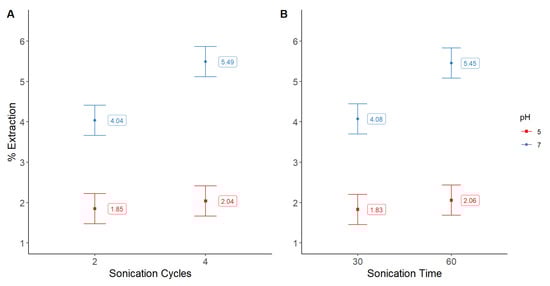 After the previous experiments, we decided to analyze the effect of sonication cycles (2 and 4) and the time of each cycle (30 and 60 s). In this case, since pH 4 yielded poor results, we analyzed again pH in the range of 5 to 7, and trehalose in the previous levels (0.15 and 0.3%). This time we observed that pH 7 was the most efficient value, both for extraction yield and purity. This time, the results were not different in response to the changes of trehalose concentration, either in extraction efficiency or purity of the pigment. Nonetheless, we could notice that sonication cycles and time of treatment had a positive impact on the pigment’s extraction (Figure 4A), but not on the purity (Figure 4B).