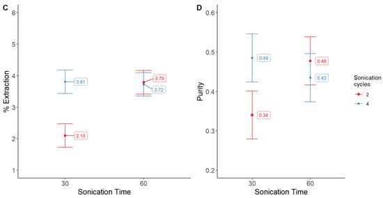 Since all two-factor combinations were significant (p < 0.05) for extraction yield, we determined the best combination to be four sonication cycles of 30 s, or two cycles of 60 s, e.g., two minutes cellular disruption treatment (Figure 5A–C). A similar effect was observed for purity, where the best option was to use the largest sonication times (Figure 5D).