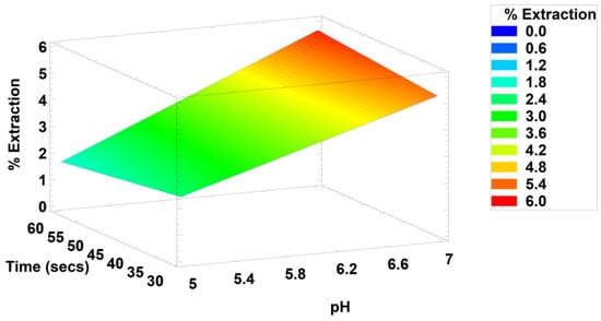 In this first set of experiments we studied the effect of two buffered solutions, and three additives: citric acid, sucrose, and trehalose. Adjali et al. [] summarized several reports where pH levels ranged mostly between 5 and 7; in this work, we decided to test the effect of buffered solutions at these two levels. Our results for this first set of experiments showed that pH 5 was the best choice; this was in accordance with Wu et al. [] who reported an optimal pH range from 5 to 6 for the extraction of the pigment from Spirulina platensis. Kumar et al. [] also reported the extraction in acetate buffer at pH 5.10 to be the best choice; in contrast, Li et al. [] reported a better extraction yield at pH 7.5. The results are someway contradictory/controversial, since in the following set of experiments presented in this report, we found a better extraction at pH 7. In general, given the higher solubility of phycocyanin at pH 7, it has been suggested as the optimal value [,,]. Then, we hypothesize that even when pH is one of the most important factors on any extraction process of phycocyanin, the extraction conditions impact on the efficiency and set point of this parameter, i.e., buffer concentration, solvent–biomass ratio, temperature, etc. []. pH values above 7 are not recommended since the phycocyanin degrades quickly. Higher pH values (7.5 and 8) were studied before [], and the authors report that even when pHs above 7 are faster in extracting phycocyanin, the pigment is unstable and suggest to adjust pH of the final solution to about 6.0 and 6.5 to preserve the pigment.