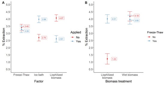 Comparative extraction yields of phycocyanin (%) as a function of three operational parameters (A), and (B) as a function of the interaction of biomass treatment vs. freeze–thaw procedure application. Bars show the least significant difference intervals for 95% confidence.