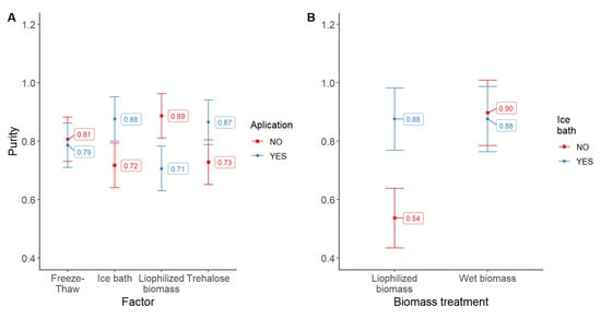 Also, we analyzed the purity of the extracted phycocyanin in the abovementioned experiment. In this case, the initial state of the biomass (wet or lyophilized), as well as the ice bath, had significative impacts on this parameter. We could measure purity of 0.88 ± 0.05 with treatments of the ice-water bath or wet biomass (non-lyophilized), as shown in Figure 8A. It is interesting to notice that an ice-water bath is necessary to obtain a good level of purity (0.88) when using lyophilized biomass, in contrast with wet biomass where the ice-water bath seems to be unnecessary or has no impact (Figure 8B).