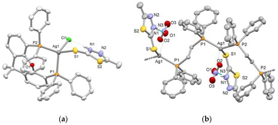 A family of Ag(I) complexes exhibiting high inhibitory potential for cancer cells proliferation involves those with heterocyclic thioamide ligands. Heterocyclic thioamides are able to adopt different coordination modes (depending on their protonation state), e.g., monodentate (κS or κΝ), bidentate chelating (κS,Ν) or bidentate bridging (μ-S,N), allowing them to act as multifunctional ligands and lead to the formation of metal complexes with diverse structural characteristics (e.g., total charge, nuclearity, metal coordination number, and geometry) [6]. Moreover, the structural resemblance of these organic compounds with basic building blocks of biological entities allows for the development of strong intermolecular interactions with various biomacromolecules, providing them with interesting biological properties and bioactivity [7]. Five-membered heterocyclic ring thioamides, and, in particular, those containing the 1,3,4-thiadiazole ring, have been reported to possess significant antiproliferative activity against different human cancer cells, a fact that was attributed, to a large extent, to the high electron-donating ability of their N atoms and their ability to interact through H-bonding with various biomolecular targets involved in cancer cell proliferation and metastasis. Moreover, 1,3,4-thiadiazole derivatives, which are bioisosteres of pyrimidine, were found to be able to interfere with DNA replication, regulate angiogenesis, or control the cell cycle in cancer cells while some of them have been used in clinical phases I-II, showing encouraging perspectives as alternatives in cancer treatment [8,9,10,11].