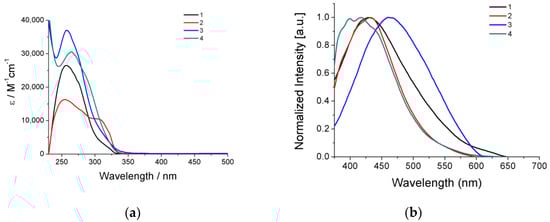 UV–visible electronic absorption spectra of the Ag(I) compounds 1–4 in CH2Cl2 solutions are dominated by high-intensity bands in the high-energy region with wavelength absorption maxima λmax(abs) between 250 nm and 270 nm and their corresponding molar absorption coefficients ε ranging from 1.6 × 104 to 3.7 × 104 M−1cm−1 (Table 2 and Figure 2a) Regarding the absorption spectra of the respective phosphine and thioamide ligands which display absorption maxima in the same region with the complexes, the high-energy bands of the compounds could be attributed to intra-ligand π∗←π transitions of the aromatic groups. In addition, isostructural complexes 1 and 3, bearing mtdztH in its neutral form, showed absorption bands at a lower intensity, at 307 and 310 nm, respectively, which can be attributed to a thioamide-originating transition.