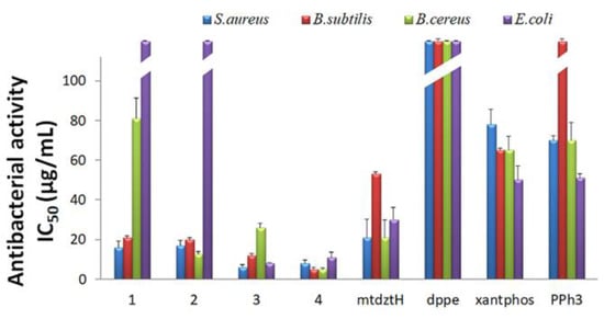 In vitro antibacterial activity of compounds 1–4, and their ligands mtdztH, dppe, xantphos, and PPh3 in free form, expressed as half-minimum inhibitory concentration (IC50) values (in μg/mL) provided by a nonlinear curve fit-growth/sigmoidal-dose response on the experimental optical density data. Values are expressed as mean ± standard deviation (SD) of three replicate measurements (with the exception of values higher than 100 μg/mL).
