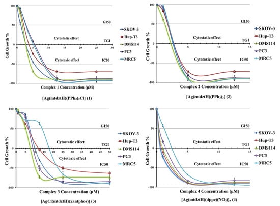 Ag(I) complexes have recently emerged as promising anti-cancer agents. In our laboratory, we have investigated the anti-cancer activity of a number of Ag(I) complexes bearing a thioamide (or thioamidate) and phosphine ligands against different cancer cell lines and found to display significant bioactivity, with some of them also exhibiting high selectivity towards healthy cells [21,29]. Herein, we present the results of the in vitro evaluation of Ag(I) compounds 1–4 against the human cancer cell lines SKOV-3 (ovarian), Hup-T3 (pancreatic adenocarcinoma), DMS114 (lung), and PC3 (prostate), as well as the human normal cell line MRC5 (lung).