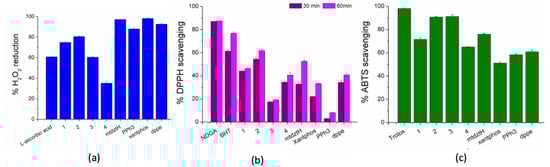 In vitro antioxidant ability of compounds 1–4, as well as their ligands mtdztH, dppe, xantphos, and PPh3 in free form: (a) H2O2 reducing ability (% H2O2), (b) DPPH scavenging activity (% DPPH) and (c) ABTS scavenging activity (% ABTS).