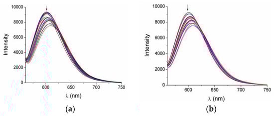 Ethidium bromide (EB) is a common DNA intercalator used in competitive studies for investigation of the potential ability of a compound to intercalate between DNA base-pairs. Within the context of the present work, increasing amounts of 3 and 4 were added to a buffered solution of EB–DNA conjugate and the changes in their emission spectra were recorded. The EB–DNA solution exhibited an intense emission band at λmax(em) = 592 nm, upon excitation at 540 nm. The addition of 3 and 4 to the EB–DNA solution led to the quenching of this EB–DNA emission band by ~26% (at low concentrations, r = 0.10-0.25) (Figure 7). Considering that 3 and 4 did not show emission maxima in this particular wavelength region, the observed fluorescence decrease can be attributed to the competitive behavior of compounds 3 and 4 with EB, while the low quenching percentage value gives an indication of the low capability of the compounds to replace EB in its binding sites on DNA. Fitting of these data on Stern–Volmer equation (Equation (2)) and the corresponding plots (Figure S7) allowed the estimation of the KSV constants for qualification of the intercalating ability of the complexes. These were found to be of the order of 104 M−1, which reveals relatively low binding strengths for both complexes. EB–DNA quenching constants kq were also calculated (Equation (3)) and found to be >1010 M−1s−1 (Table 4), suggesting that the decrease in EB–DNA fluorescence induced by these two compounds occurs via a static mechanism due to the formation of a new compound–DNA conjugate [35].