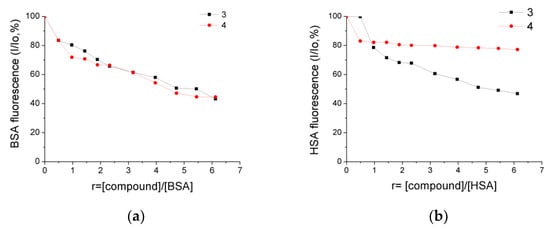 Plots of percentage of fluorescence intensity changes (I/Io, %) at (a) λmax(em) = 350 nm for BSA and (b) λmax(em) = 338 nm for HSA, in buffer solutions (150 mM NaCl and 15 mM trisodium citrate at pH = 7.0) upon addition of increasing amounts of compounds 3 and 4 versus r = [compound]/[BSA] and r = [compound]/[HSA], respectively.
