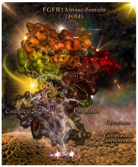 Complex 2 seems to be anchored in the binding pocket of the enzyme formed by the FGFR1 protein’s segments: the activation loop (a-Loop); aD helix; and β1, β2, and β8 antiparallel beta sheets. Ponatinib (flanked by β2, β3, and β5 sheets and also positioned between the loop formed by the β4 sheet and αC helix and also the hinge region connecting the β5 sheet and αD helix) and 2 are flanked by an a-Loop and β1 and β2 beta sheets, in the upper and lower part of the binding cavity, respectively, and also by the hinge region connecting the β5 sheet and αD helix (in the middle position of the binding cleft).