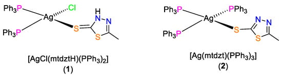 - Varna, D.; Kapetanaki, E.; Koutsari, A.; Hatzidimitriou, A.G.; Psomas, G.; Angaridis, P.; Papi, R.; Pantazaki, A.A.; Aslanidis, P. Heterocyclic thioamide/phosphine mixed-ligand silver(I) complexes: Synthesis, molecular structures, DNA-binding proper-ties and antibacterial activity. Polyhedron 2018, 151, 131–140. [Google Scholar] [CrossRef]