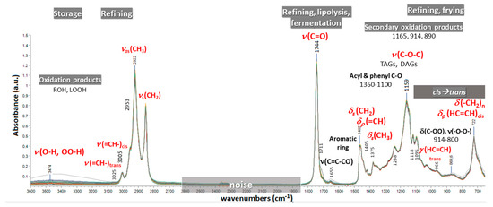 In the case of edible oils, chemometric models based on mid-infrared (MIR) spectroscopic data often perform better than near-infrared (NIR) and Raman ones, when studying quality issues in general [19]. FTIR spectroscopy represents a powerful, versatile, non-destructive technique of low analysis cost, an alternative to wet-chemical and time-consuming techniques. It monitors the fundamental vibrational and rotational movements of molecules upon absorption of light in the mid-infrared region of the electromagnetic spectrum (4000 to 400 cm−1). This region retains information about the structure and conformation of proteins, polysaccharides and lipids that can be useful for diagnostic purposes. Multiple signals of varying frequency/intensity, due to the contribution of multiple analytes or even the sample matrix itself, compose the FTIR spectrum of an oil sample at a particular time slot. Therefore, by spectral data analysis, it is possible to identify, monitor and track undesired structural changes in lipid molecules in terms of, e.g., the chain length, unsaturation, trans/cis configuration of double bonds or ester linkages of fatty acids. Many factors related with intrinsic characteristics of the olive fruits (genetic, physiological) and environmental conditions (oxygen, light, temperature) may induce molecular transformations during the production, handling and storage of the EVOO/VOO products, giving rise to subtle variation in their spectra. Figure 1 displays characteristic peaks and bands in the raw FTIR spectra of virgin olive oils, along with assignments [21] that are considered diagnostic of quality deterioration during various conditions of processing and storage. As an example, variance in the band at 966 cm−1 due to isolated (non-conjugated) trans double bonds [22], but also in the region between 914 to 800 cm−1 [23,24], may reveal the presence of thermal oxidation products. In contrast, variance at around 1746 cm−1 due to carboxylic ester groups is expected to carry information about improper conditions of olive storage and elevation of fatty acid ethyl esters (FAEEs) content [25]. Chemometric analysis of the spectral data is indispensable and may offer insight to the “natural” variability in pure virgin olive oil composition. Beyond inherent variation, the presence of extraneous matter, e.g., oils of foreign botanical origin or extraneous pigments, can also induce invisible differential changes that can be exposed, depending on the quality of the attained spectroscopic data and the overall strategy of chemometric modeling and validation [26]. The signals in the fingerprint region from 1500 to 700 cm−1, as well as the C–H stretching bands from 3100 to 2800 cm−1, are often under scrutiny, as they can be diagnostic of the target adulterant. Usually, shifted bands between 3003 and 3020 cm−1 that are due to C-H stretching in cis-olefins denote a high level of unsaturated fatty acids and adulteration with seed oils. In practice, as spectral variance arises synchronously from C–H, C–O and C=C vibrations in different structural units of the predominant acylglycerols, it is impossible to identify the extraneous botanical origin in complex olive oil blends [27]. Chemoinformatic databases with FTIR spectroscopic data for EVOO/VOO or other types of oil samples are necessary for fingerprint analyses [26,28]. However, given the lack of standard assessment protocols, confusion about the terminology and misuses, misinterpretation of the research findings are often encountered in the scientific literature [6,29,30,31].